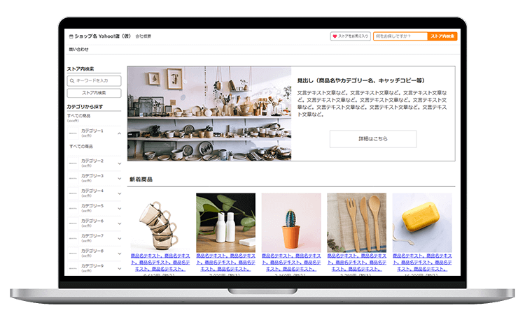 制作内容は主にトップページがメインとなりますが、共通部分(看板エリア・フッターエリア)も、商品ページ等に反映されますので、ご安心下さい。