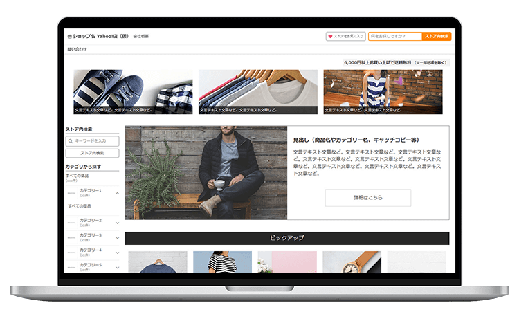 制作内容は主にトップページがメインとなりますが、共通部分(看板エリア・フッターエリア)も、商品ページ等に反映されますので、ご安心下さい。